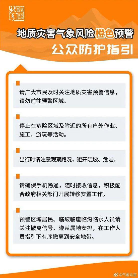 北京市規(guī)劃自然資源委聯(lián)合市氣象局升級發(fā)布地質災害氣象風險橙色預警,8月26日20時至8月27日20時,北京市房山、門頭溝大部發(fā)生崩塌、滑坡、泥石流等地質災害的風險高(橙色預警);豐臺西北部,石景山北部,海淀西北部,昌平、延慶大部,懷柔中部,密云西部發(fā)生崩塌、滑坡、泥石流等地質災害的風險較高(黃色預警);石景山北部,海淀西部,昌平東北部,懷柔北部、南部,密云、平谷大部有發(fā)生崩塌、滑坡、泥石流等地質災害的風險(藍色預警)。