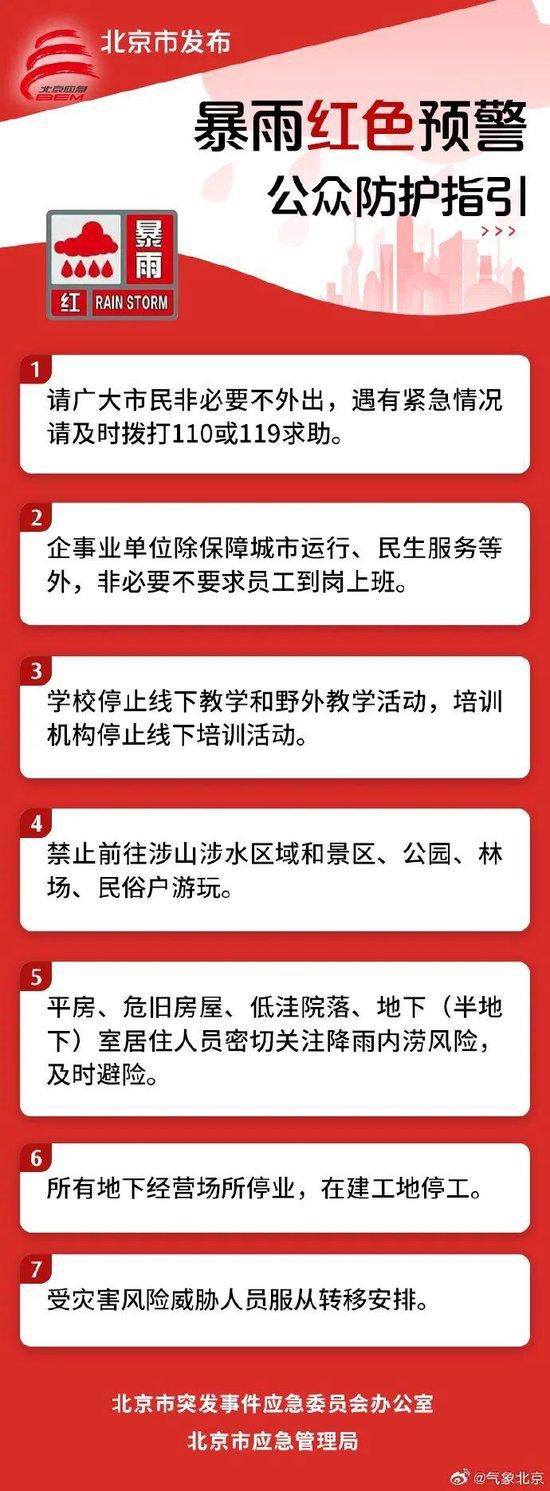 北京市防汛辦提示:防汛一級應急響應區(qū)域市民非必要不外出,確需出行人員關注出行提醒,遇有積水路段請勿涉水行車,不要在低洼路段和區(qū)域停放車輛。企事業(yè)單位除保障城市運行、民生服務等外,非必要不要求員工到崗上班。停止有組織的文旅活動和文化藝術培訓、室內外體育賽事活動及體育運動類培訓活動,并做好人員的安全疏散工作。學校停止全部線下教學活動和野外教學活動,培訓機構停止全部線下培訓活動,妥善安置、安全轉移相應滯留人員。在建工地停工,及時轉移、妥善安置相關工地人員。停止涉山涉水戶外旅游,關閉所有景區(qū)、公園、林場,民宿和民俗戶停業(yè),游客疏導勸返,并做好受威脅游客疏散避險。